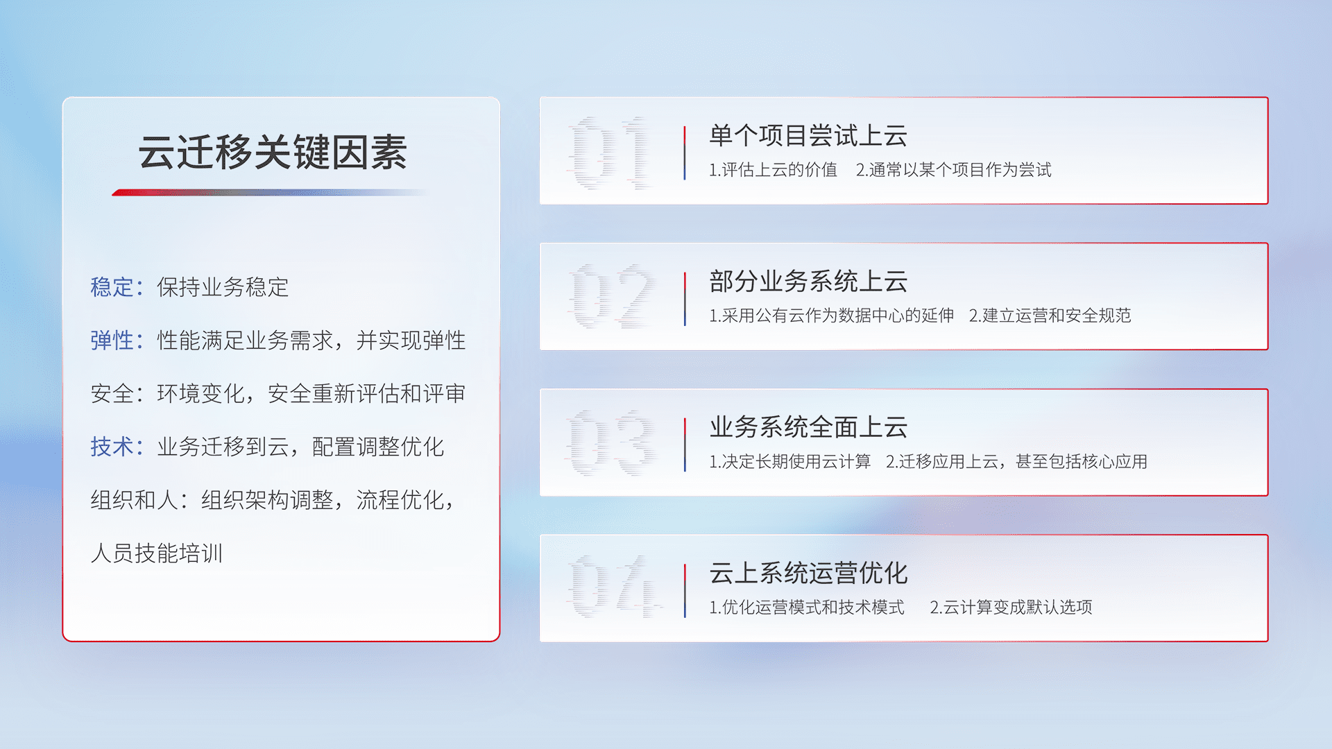 结合实际业务,,,从规划设计、、、云平台选型、、、云原生改造、、数据迁移、、集成交付,,,,迁移全过程为客户识别最佳上云路径,,,,做好风险识别管理,,设计网络架构、、、身份权限、、安全审计合规、、、操作审计、、、日志审计、、监控告警策略、、、、多站点容灾设计等,,对云上基础设施进行整体规划,,提升IT治理水平,,以满足弹性、、高可用、、、高性能的需求。。。