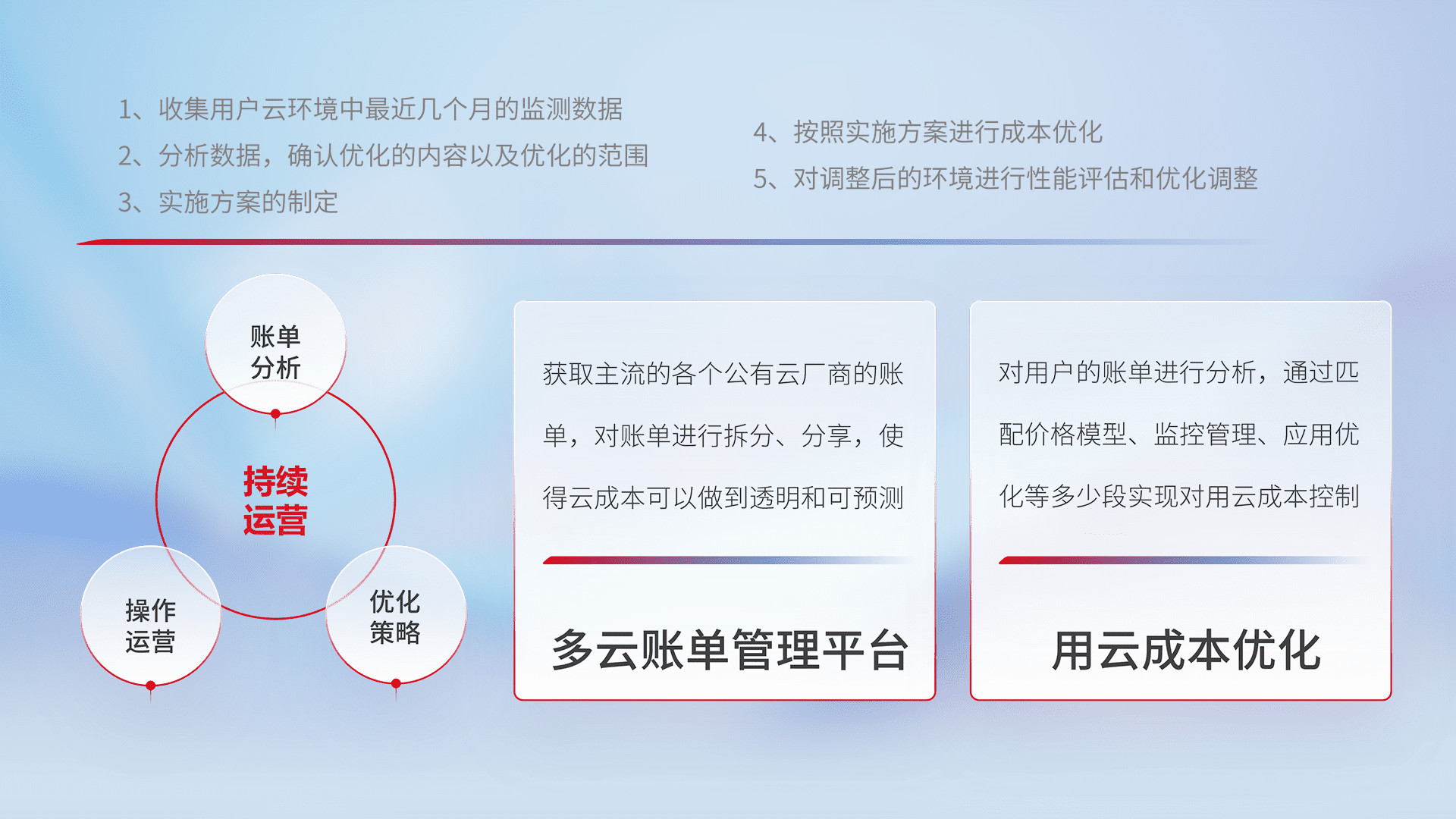 通过多云纳管,,,,以统一的资源数据模型把客户的云资源进行抽象和封装,,,进而实现对多云资源的统一操作,,保障云资源管理的可靠性、、、、稳定性与可用性。。量身定制化运维内容,,,配置、、、、开发运维、、补丁管理、、、、备份、、监控、、、认证和访问管理、、、审计和日常巡检等,,,保障在用云过程中的可靠度,,,,稳定度以及高可用率。。