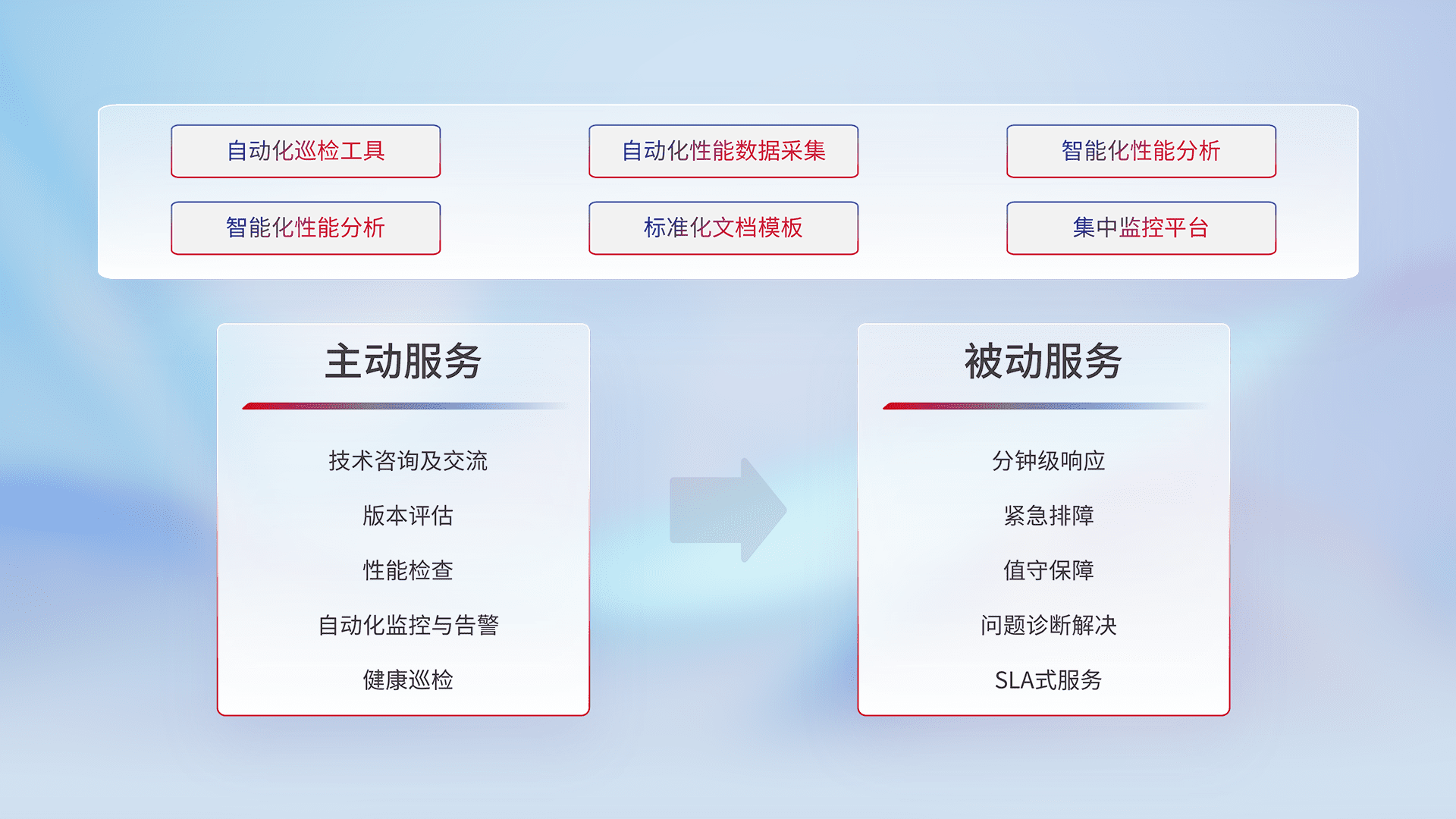 智能化工具和标准化文档,,保障服务质量,,提供主动服务(包含技术咨询、、版本评估、、、、性能检查、、、自动化监控与告警、、健康巡检)和被动服务包含(分钟级响应、、紧急排障、、、、值守保障、、、、问题诊断解决、、、SLA服务)。。